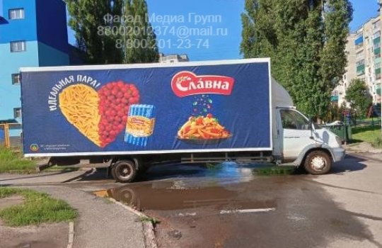 РПК Фасад Медиа Групп изготовила и смонтировала тент с рекламой на машину нашего клиента