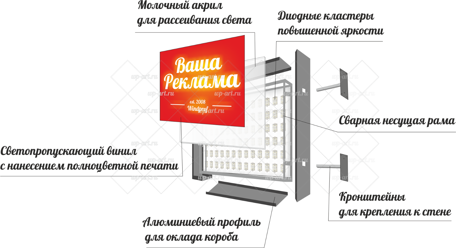 Панель-кронштейн – это разновидность светового короба, представляющая собой одностороннюю или двустороннюю конструкцию, которая крепится к стенам домов, зданий и сооружений, а также к столбам уличного освещения и предназначена для размещения рекламного объявления, логотипа, бренда компании в целях привлечения внимания потенциальных клиентов к товарам и услугам.
