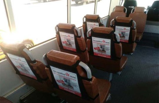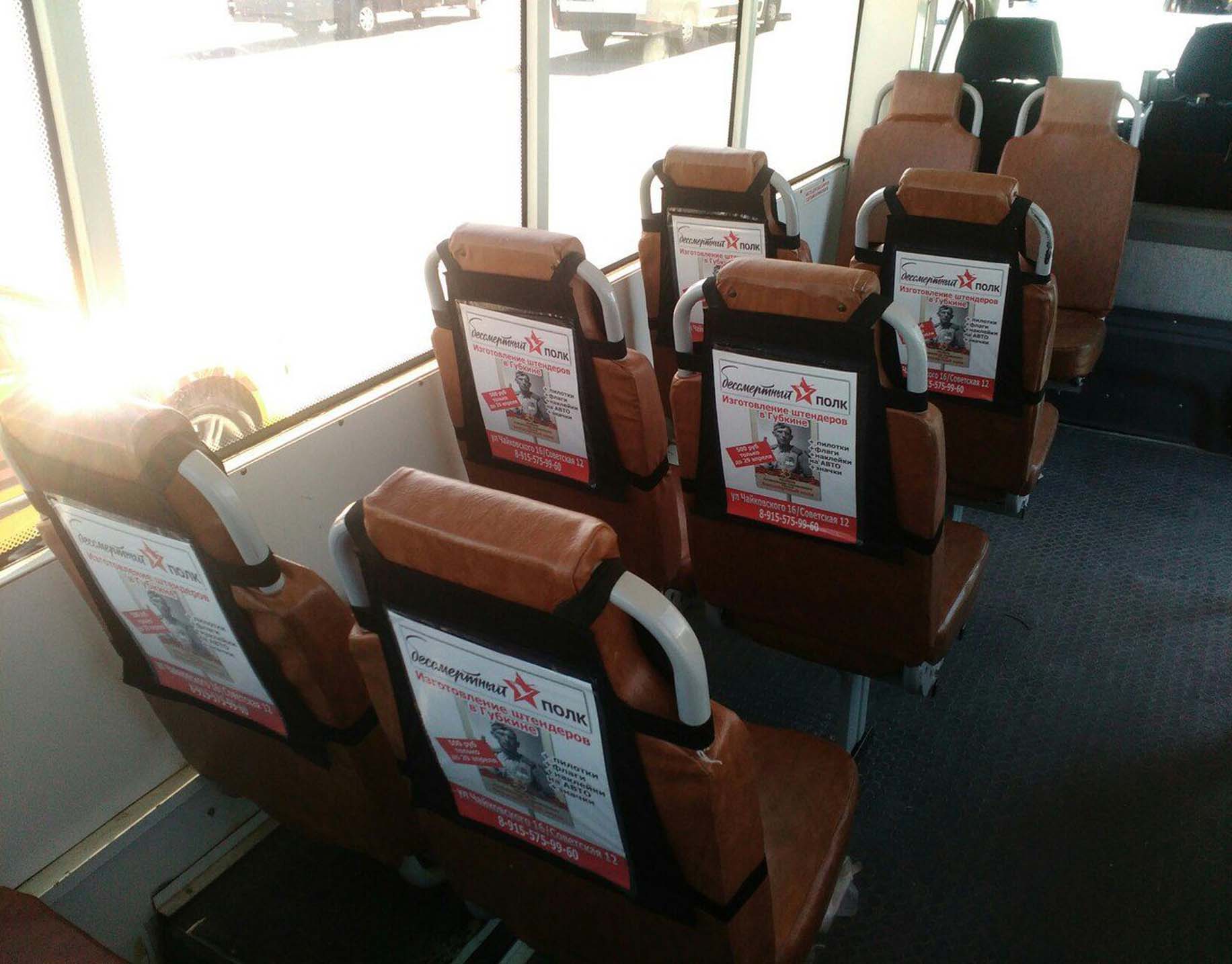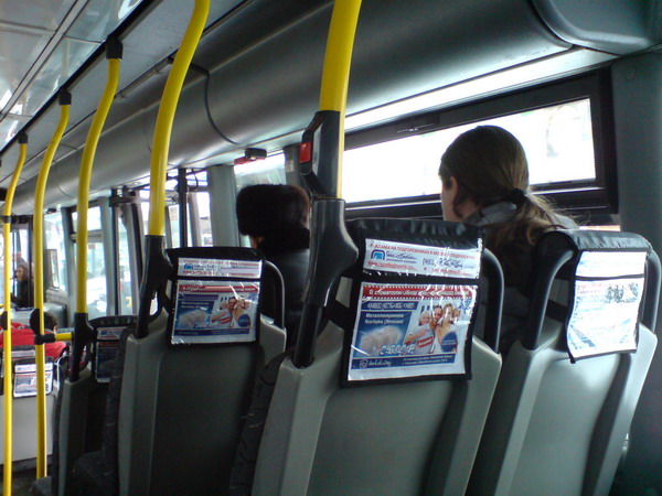 Реклама на подголовниках в трамвае на фото выше
