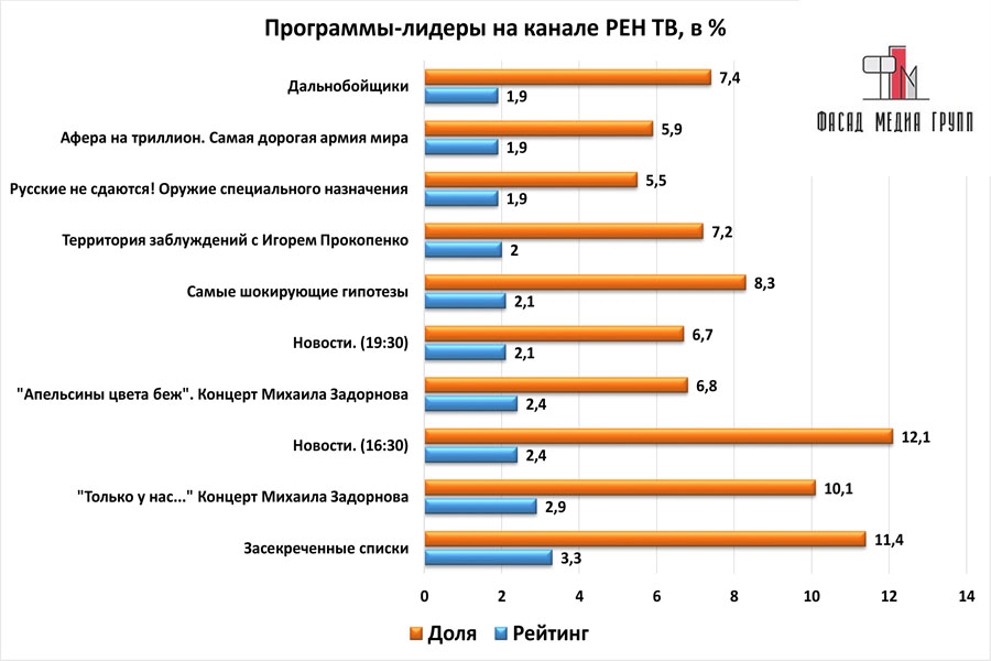 Популярность телеэфира на «РЕН ТВ» приводит к ежегодному увеличению спроса на рекламное время. Для привлечения клиентов из разных регионов России, увеличения процента продаж, повышения имиджа компании и узнаваемости бренда – размещайте рекламу на «РЕН ТВ». «РЕН ТВ» – это проверенный и востребованный канал для размещения рекламы на химкинском ТВ. Для размещения рекламы на телевидении обращайтесь в рекламное агентство «Фасад Медиа Групп». Будем рады сотрудничеству.