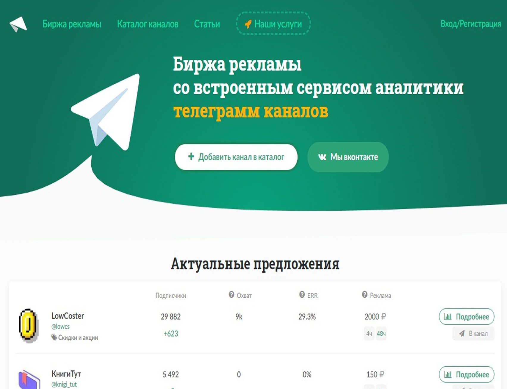 Биржа рекламы предлагает не только список Телеграм-каналов, но и статистику каналов, позволяет найти рациональное предложение благодаря аналитике каждой площадки. По большому счету, биржа рекламы является связующим звеном между владельцами каналов и рекламодателями, помогая одним искать рекламодателей, а другим – искать каналы размещения рекламы. Пример биржи рекламы в Telegram (Телеграм) представлен на фото: