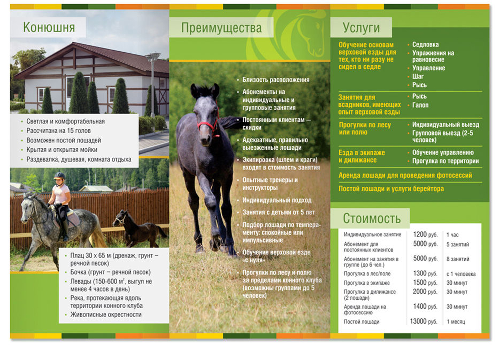Реклама в конных клубах отличается тем, что рекламные материалы располагаются на уровне глаз потенциального клиента или покупателя. Удачное расположение рекламы приводит к тому, что листовки, буклеты и другие форматы рекламы в конных клубах хорошо видны и обеспечивают 100% читаемость со стороны посетителей.